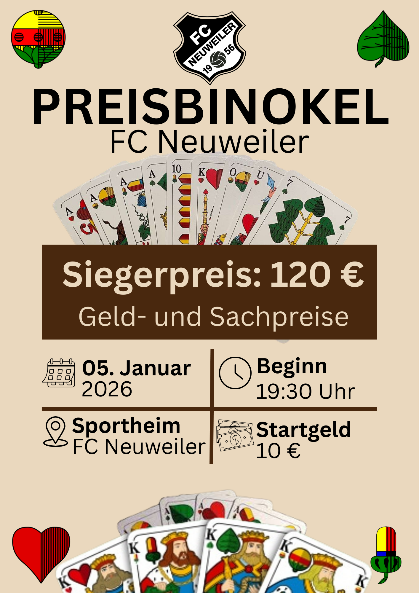 Preisbinokel beim FC Neuweiler Der FC Neuweiler lädt herzlich zum Preisbinokel ein.Am Montag, den 05. Januar 2026, treffen sich Binokelfreunde im Sportheim des FC Neuweiler, um in geselliger Atmosphäre ihr Können unter Beweis zu stellen. Der Spielbeginn ist um 19:30 Uhr.Das Startgeld beträgt 10 €. Auf die Teilnehmer warten attraktive Geld- und Sachpreise, darunter ein… Weiterlesen