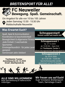 Der FC Neuweiler lädt alle von 10 bis 100 Jahren ein, gemeinsam aktiv zu sein – ganz egal ob Anfänger oder Fortgeschrittene!